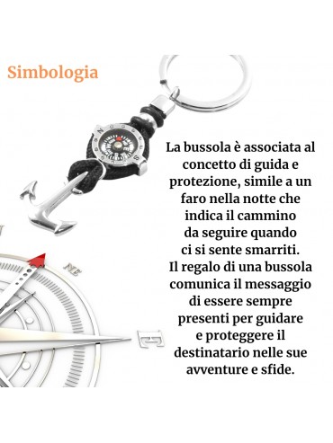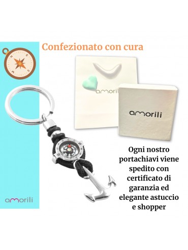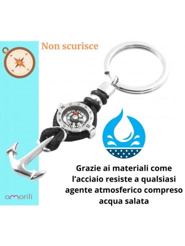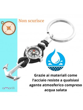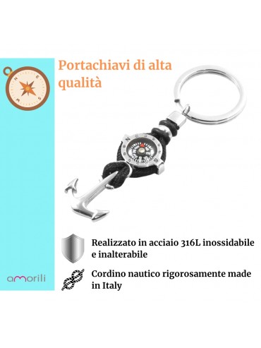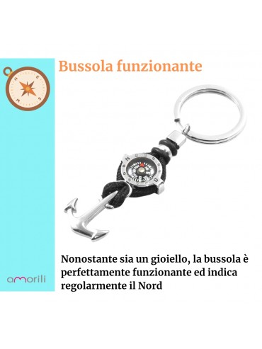 Portachiavi uomo con bussola e ancora marinara in acciaio e cordoncino nero lungo cm 8 lago max cm 3 prt0008